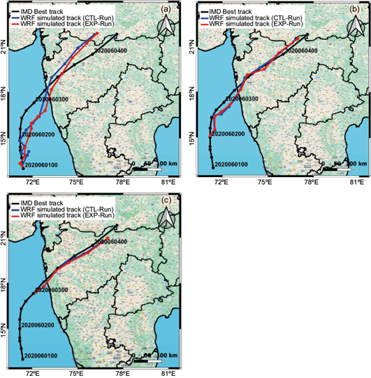 Fig. 5 Simulated tracks from CTL-run and EXP-run for (a) 72 h from the IC at 00:00 UTC on June 1, 2020 (b) 48 h from the IC at 00:00 UTC on June 2, 2020, and (c) 24 h from the IC at 00:00 UTC on June 3, 2020, along with the IMD’s best track for SCS Nisarga.