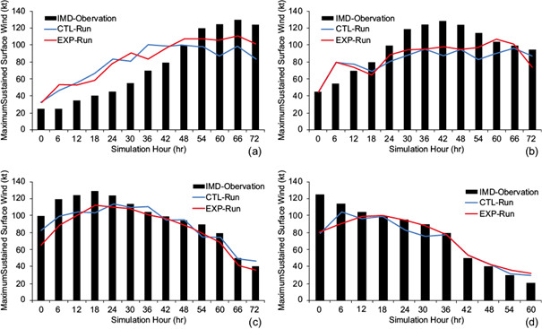 For the simulation at 00:00 UTC on May 16, 2020, Figure 7a shows that both CTL-run and EXP-run have overestimated the MSSW from the beginning to the 48-h lead time. Initially, the MSSW recorded from IMD observations was 46.3 km-1, whereas CTL and EXP-run estimated it as 59.1 km h-1. Subsequently, beyond the 48-h lead time, it was noted that the EXP-run MSSW plot closely aligned with the IMD observation compared to the CTL-run. Figure 7b illustrates the simulation from the IC at 00:00 UTC on May 17, 2020. After a 12-h lead time, EXP-run MSSW values are observed to be closer to IMD observations as compared to the CTL-run. Figure 7c shows the MSSW values for another simulation conducted from the IC at 00:00 UTC on May 18, 2020. It is observed that both CTL-run and EXP-run underestimated the MSSW values until the 30-h lead time, after which the EXP-run MSSW plot exhibited a smoother trend relatively closer to the IMD MSSW observations as compared to the CTL-run. Figure 7d illustrates the MSSW value from the simulation form the IC at 00:00 UTC on May 19, 2020; after a 12-h lead time, the EXP-run MSSW values were found to be more closely aligned with IMD MSSW observations as compared to the CTL-run. Figure 7 shows that during the initial simulation hours, there is a deviation in both CTL-run and EXP-run from the IMD observations, mainly due to the model’s spin-up time (Jerez et al., 2020).