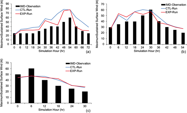 The MSSW associated with a TC is a standard measure of the cyclone’s intensity. Figure 7 depicts the variation of MSSW regarding different ICs for different simulation hours for CTL-run and EXP-run in relation to the IMD-MSSW observation for SuCS Amphan.