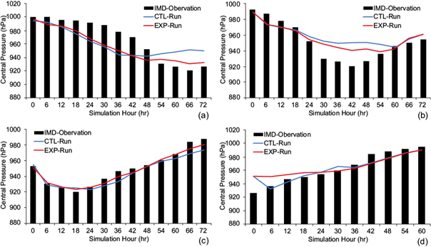Fig. 9 Simulated central pressure values from CTL-run and EXP-run compared to IMD observed central pressure values from (a) the IC at 00:00 UTC on May 16, 2020, (b) the IC at 00:00 UTC on May 17, 2020, (c) the IC at 00:00 UTC on May 18, 2020, and (d) the IC at 00:00 UTC of May 19, 2020, for SuCS Amphan.
