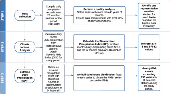 The methodology for the present study involved several steps, including data collection, climate index, analysis to calculate the SPI, and extreme precipitation event analysis. The latter was conducted using a fitted Weibull continuous distribution to determine the 99th percentile (P99) of the precipitation series. Figure 1 summarizes the steps of the methodology.