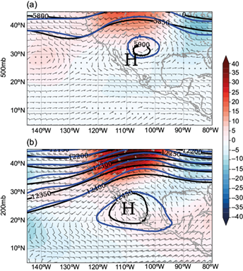 Fig. 10 Geopotential height anomalies (m) for 2011-2012 and wind fields for (a) 500 mb and (b) 200 mb. Black lines represent climatological values (1981-2022), and blue lines show values of the 2011-2012 case study. Regions with well-defined high pressure are marked with the letter H.