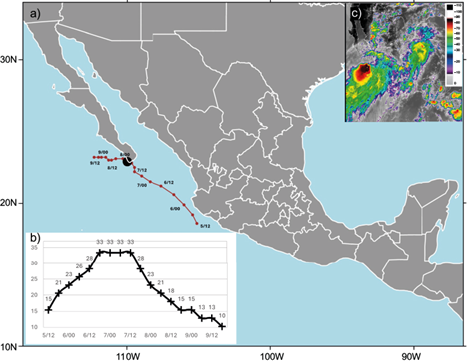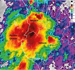 Table III shows that P99 values change from station to station, due to the great spatial variability in the state. In addition, a TC approach can affect more than one station simultaneously, as it occurred on September 15, 2013 (TC Manuel) and September 5-6, 1999 (TC Greg), when three EDP events were identified at three different stations. In addition, the development of mesoscale convective systems (MCSs) provides favorable conditions for heavy precipitation, such as the MCS that occurred over Jalisco on July 23-24, 2010 (Fig. 12), which had an impact at station 14044 (Table III).