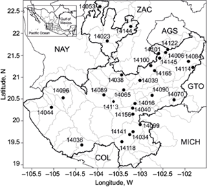 Table I Selected climatological stations in the state of Jalisco, Mexico, for the period 1980-2019.
