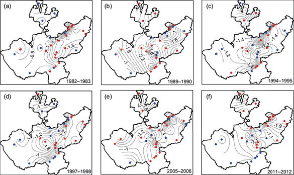 Fig. 3 Standardized Precipitation Index (SPI-3) series. Red (blue) dots are the groups of stations where drought events with large surface coverage were recorded (not recorded) for the periods: (a) 1982-1983, (b) 1989-1990, (c) 1994-1995, (d) 1997-1998, (e) 2005-2006, and (f) 2011-2012. Dashed lines are contours with the highest SPI-3 values at 0.2 intervals.