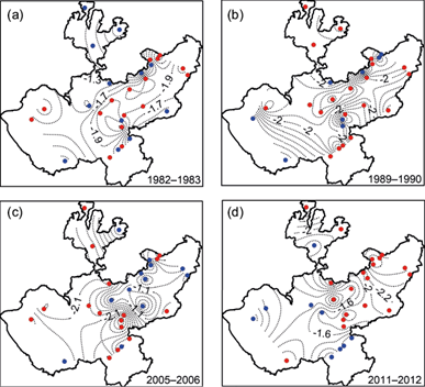 Fig. 4 Standardized Precipitation Index (SPI-12) series; dots are the group of stations recorded (red) and not recorded (blue) drought events with large surface coverage for the periods: (a) 1982-1983, (b) 1989-1990, (c) 2005-2006, (d) 2011- 2012. Dashed lines are contours with the highest SPI-12 value at 0.2 intervals.