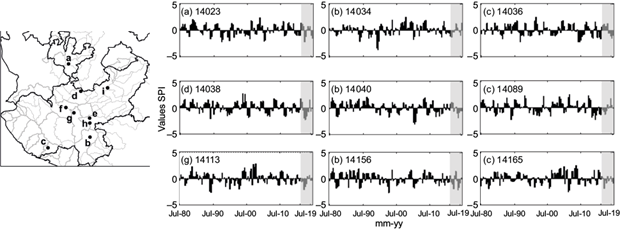 In addition to the drought events with large area coverage, an additional analysis was performed where droughts that have occurred in the last years (2015-2019) were identified, mainly at a seasonal scale (SPI-3). In total, nine stations were identified that recorded droughts in that period (Fig. 5), most of them in the central region of the state.