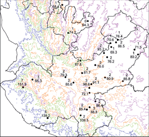 The results indicate that of the 57 events identified, 28.0% (16 events) were recorded in July, 31.6% (18) in August, and 40.4% (23) in September, which was the most prolific month, with seven of the 23 extreme events occurring at stations near the coast (Fig. 6), in addition to having the highest thresholds mainly due to the passage of tropical cyclones (TCs). The peaks of activity in which EDP events occurred most frequently were 1987, 1999, 2010, and 2013, with 18 events, representing 31.6% of the total. The years 1999 and 2013 were the most active, with five events each, and 1987 and 2010 with four each, concentrating only on 11 of the 28 stations (Table III).