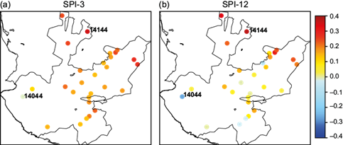 A time correlation analysis between SPI and ONI shows that most stations are positively correlated, particularly for correlations with SPI-3 and lag 0 (Fig. 7), while SPI-12 showed negative correlations close to the coast and in the northwestern region. This relationship would indicate that El Niño conditions are subject to wetter conditions, while those of La Niña are subject to drier conditions. The largest correlation coefficient between ONI and SPI-3 is 0.36 and 0.37 for SPI-12, both for station 14144 located in the northern region; station 14044 exhibits the most negative correlation, which is greater in SPI-12. The statistical relationship between ONI and SPI showed a strong association in the northern and northeastern regions (inland) of the state, and lower near the coast.