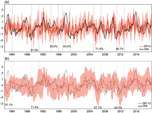 Fig. 8 Standardized precipitation index (SPI) and Oceanic Niño Index (ONI) series: (a) SPI 3 and (b) the SPI 12. The red line indicates the SPI mean across stations and shaded areas indicate ±2.0 times the standard deviation (σ). Percentages correspond to values indicated in Table III.