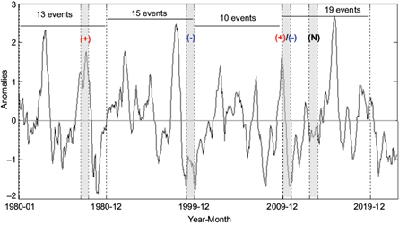 Various indices monitor climate oscillations. In this study, we use the Oceanic Niño Index (ONI), which records the three-month mean SST anomalies in the tropical Pacific for the Niño 3.4 region (5º N to -5º S, 120º to 170º W). The present study defines ONI as ONI+ (ONI-) when its value exceeds 0.5 (is less than -0.5). Index values were obtained from the National Oceanic and Atmospheric Administration and Earth System/ Physical Sciences Laboratory (NOAA/PSL; https://psl. noaa.gov/data/climateindices/list/index.html).