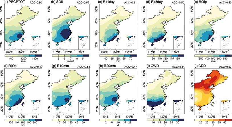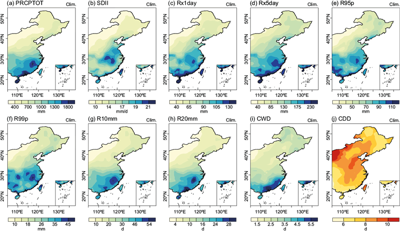 First, we examine the climatology for the 10 extreme precipitation indices during summer, calculated from the data of 1310 stations in eastern China from 1961 to 2020. As shown in Figure 2, a pattern of wetter conditions in the south and drier conditions in the north (i.e., the “south flooding, north drought” pattern) is observed in eastern China. Specifically, PRCPTOT, R10mm, and R20mm exhibit similar spatial patterns, with maximum values concentrated in the southeastern coastal region. The maximum PRCPTOT exceeds 1800 mm, while the maximum R10mm and R20mm exceed 54 and 28 d, respectively (Fig. 2a, g-h). Additionally, the spatial distribution of R×1day and R×5day shows similar characteristics, with peak values in the southeastern coastal region, the Yangtze River Basin, and the boundary area between the Yangtze River Basin and the southeastern rivers. The maximum R×1day exceeds 130 mm, and the maximum R×5day exceeds 230 mm (Fig. 2c-d). However, the spatial distribution of SDII, R95p, R99p, CWD, and CDD shows some differences. SDII exhibits its highest values in the southeastern coastal region, Hainan Island, and large areas of the Huai River Basin, Yangtze River Basin, and southeastern rivers, with maximum values exceeding 21 mm d-1 (Fig. 2b). The highest R95p values are located in the middle and lower reaches of the Yangtze River and the Pearl River Basin, with maximum values above 110 mm, though there is a relatively low-value zone in the eastern Pearl River Basin, with a center of 60-70 mm (Fig. 2e). R99p exhibits scattered peaks south of the Yangtze River, with maximum values exceeding 45 mm (Fig. 2f). CWD gradually decreases from southeast to northwest, with the highest values in the southeastern coastal region. The maximum CWD in the eastern Pearl River Basin exceeds 5.5 d (Fig. 2i). On the other hand, the highest CDD values are found in central Inner Mongolia, exceeding 10 d, while the lowest values are distributed south of the Yangtze River, across most of Heilongjiang, and parts of Guizhou, Sichuan, and Guangxi, where the minimum values are below 6 d (Fig. 2j).