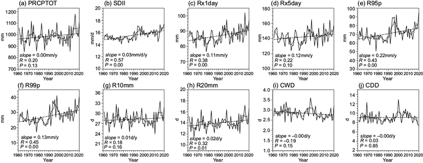 This study utilizes 10 precipitation indices defined by the ETCCDI under the Climatology Commission of the World Meteorological Organization (WMO) (Karl and Easterling et al., 1999; Zhang et al., 2011) (Table II), including total annual precipitation (PRCPTOT), precipitation intensity (SDII), R×1day, R×5day, R95p, very heavy precipitation (R99p), number of heavy rain days (R10mm), number of very heavy rain days (R20mm), CWD, and CDD.