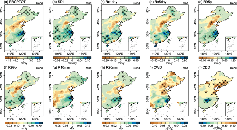 Fig. 4 Spatial distribution of trends in summer extreme precipitation indices derived from station observation data in eastern China from 1961 to 2020, with significant trends indicated by black dots at the 0.05 level of confidence.