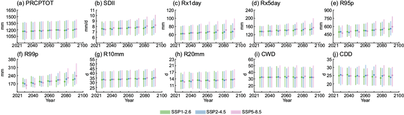 Fig. 6 Future projections of summer extreme precipitation indices over eastern China from 2021 to 2100 based on the ensemble means of 20 CMIP6 models. The green, blue, and purple error bars represent the decadal averages under the SSP1-2.6, SSP2-4.5, and SSP5-8.5 scenarios, respectively.