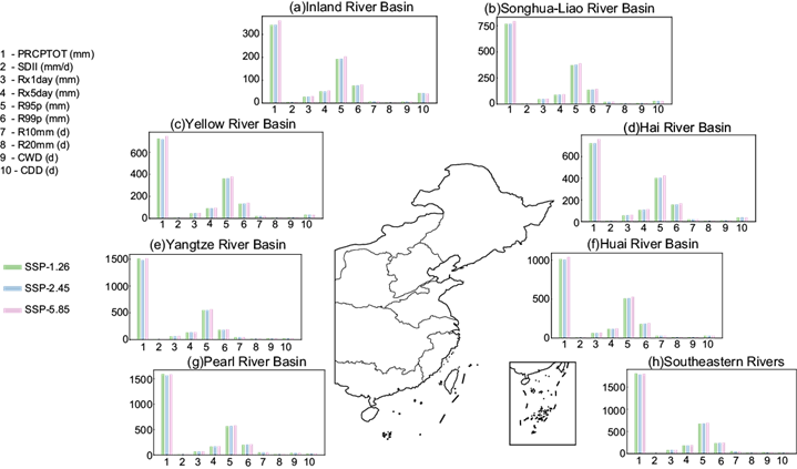 Further analysis of the changes in the 10 extreme precipitation indices across the different river basins in eastern China from 2021 to 2100 (Fig. 7), using relative changes (future vs. historical periods), reveals spatial heterogeneity in future trends. In terms of precipitation frequency (R10mm and R20mm), the Southeast Rivers Basin > Pearl River Basin > Yangtze River Basin > Huai River Basin > Songhua-Liao River Basin > Hai River Basin > Yellow River Basin > Inland Rivers Basin (the average projected R10mm values under the three scenarios in these basins are 54.49, 51.20, 47.74, 31.82, 21.60, 21.40, 20.90, and 7.56 d, respectively; the average projected R20mm values are 21.29, 16.28, 16.58, 12.88, 7.10, 7.86, 7.24, and 1.88 d, respectively). In terms of precipitation intensity (R×1day, R×5day, R95p, and R99p), the Southeast Rivers Basin > Pearl River Basin > Yangtze River Basin > Huai River Basin > Hai River Basin > Yellow River Basin > Songhua-Liao River Basin > Inland Rivers Basin (the average projected R×1day values under the three scenarios in these basins are 83.29, 70.51, 63.86, 66.45, 59.04, 48.25, 48.95, and 28.73 mm, respectively; the average projected R×5day values are 186.29, 169.63, 137.96, 119.90, 110.94, 93.35, 91.39, and 52.41 mm, respectively; the average projected R95p values are 683.36, 574.38, 556.03, 516.66, 410.87, 367.85, 380.11, and 196.78 mm, respectively; the average projected R99p values are 241.54, 205.59, 186.80, 186.25, 161.99, 136.12, 139.46, and 78.13 mm, respectively). In terms of total precipitation (PRCPTOT), the Southeast Rivers Basin > Pearl River Basin > Yangtze River Basin > Huai River Basin > Hai River Basin > Yellow River Basin > Songhua-Liao River Basin > Inland Rivers Basin (the average projected PRCPTOT values under the three scenarios in these basins are 1799.86, 1799.86, 1502.78, 1020.32, 776.23, 735.63, 728.42, and 348.06 mm, respectively). In summary, future summer precipitation in eastern China is expected to show a decreasing spatial distribution from south to north and east to west, maintaining the “south flooding, north drought” pattern. Particularly, the future total summer precipitation, extreme precipitation frequency, and extreme precipitation intensity in the Southeast Rivers Basin, Pearl River Basin, and Yangtze River Basin will significantly increase.