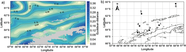 Fig. 2 (a) Distribution of Euclidean distances. The plot shows the variation in distances calculated during the clustering process, where smaller distances indicate a stronger match to the centroid, and larger distances suggest a weaker association. (b) Representative points selected: (1) 63.5º S, 60º W; (2) 64º S, 61.5º W; (3) 64.5º S, 63º W; (4) 63.5º S, 62.75º W; (5) 61.75º S, 62.5º W; (6) 60.25º S, 57.75º W.