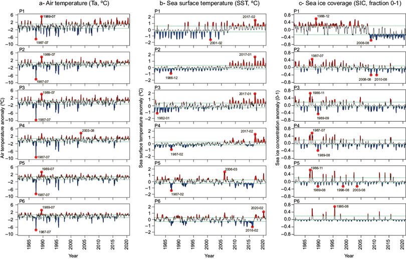 Fig. 3 Time series anomalies at reference points (1-6), calculated using the 1981-2020 climatological baseline. (a) Air temperature (Ta, ºC); (b) sea surface temperature (SST, ºC); and (c) sea ice coverage (SIC, fraction 0-1).