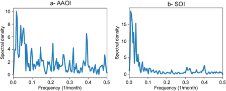 The spectral density calculated for the AAOI and SOI indices is presented in panels a and b of Figure 4, respectively. In these graphs, the x-axis represents the frequency, where period and frequency are reciprocal (e.g., a 15-month period corresponds to a frequency of 1/15 or 0.067 month-1). The AAOI periodogram reveals a series of distinct peaks rising above the background noise, indicating multiple periodic components that significantly contribute to the variability of the time series. Each peak represents a specific frequency associated with a recurring pattern or cycle in the AAOI. The dominant spectral components contributing to the variability of the AAOI correspond to cycles of approximately 2.2 and 5.2 years (Fig. 4a), both of which are statistically significant at the 5% level (p-value < 0.05). Similarly, the SOI periodogram displays two dominant spectral density peaks, indicating that its variability is primarily driven by cycles of approximately 2.4 and 3.5 years (Fig. 4b).