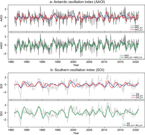 Fig. 5 Original series (gray curve) and main cycles extracted using a bandpass filter (red and blue curves, above), along with the sum of principal components (green curve, below) for (a) the Antarctic Oscillation Index (AAOI) and (b) the Southern Oscillation Index (SOI) during the period 1981-2020.