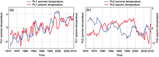 EOF1 and EOF2 analyses for summer and autumn temperature (Fig. 3).