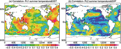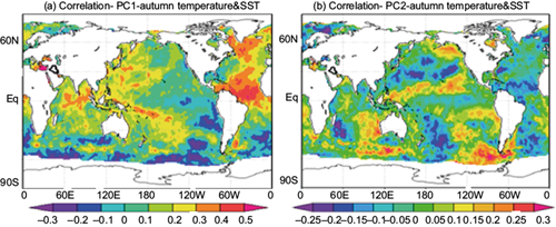 Correlation maps of PC1 and PC2 temperatures with global SST fields during summer and autumn over the period 1971-2010 (Figs. 4 and 5).