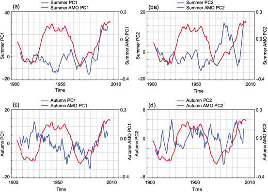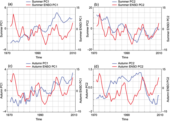 Fig. 3 Summer and autumn temperatures for the period 1971-2010. (a), EOF1 summer values, (b) EOF2 summer values, (c) EOF1 autumn values, and (d) EOF2 autumn values.