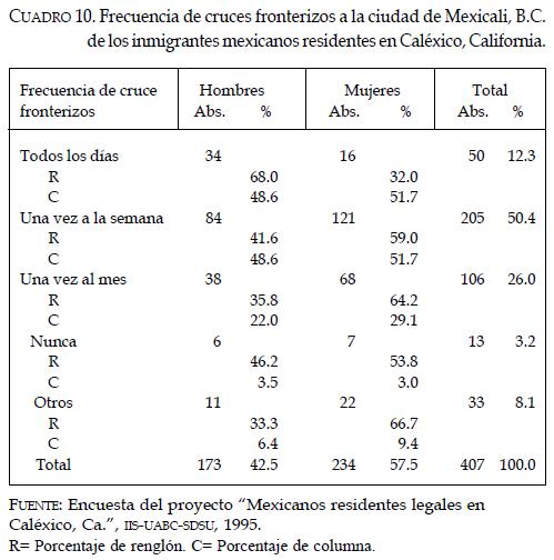 Volver de forma definitiva sería difícil para la mayoría, pues como se mencionó, muchos tienen resueltos los problemas por los cuales tuvieron que dejar su país, aunque en general el inmigrante no pierde el contacto con su lugar de origen, ya que mantiene los vínculos sociales establecidos a través de visitas y estancias que realizan frecuentemente. Por ejemplo, más del 50% de los entrevistados cruza la frontera una vez a la semana a la ciudad de Mexicali, Baja California; 26% una vez al mes; 12.3% todos los días, y sólo el 3.2% respondió que no cruza la frontera (ver cuadro 10).