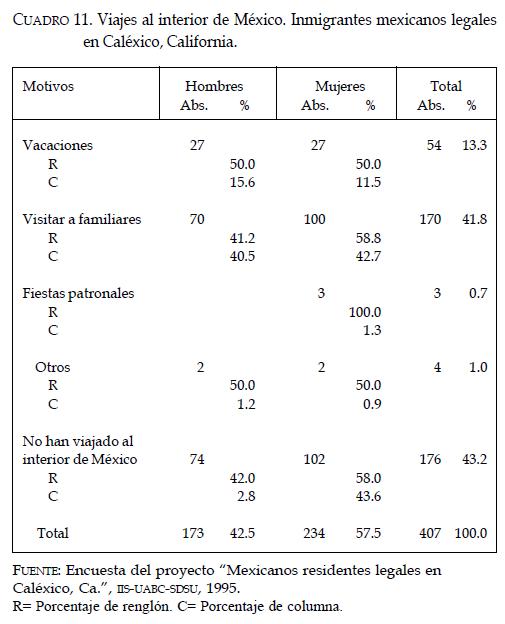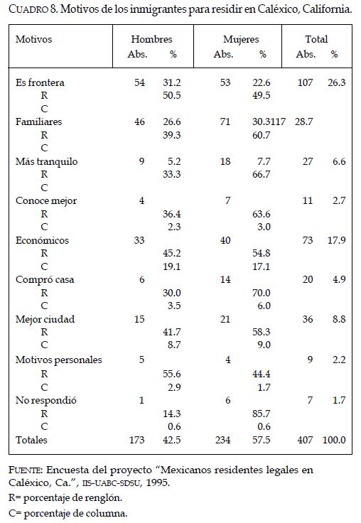 Lo que motivó a más de la mitad de este grupo de inmigrantes (56.1%) a cruzar la frontera, es ir a visitar a sus familiares; 24.4% lo hace para realizar compras (productos de abarrotes, sobre todo cuando la paridad del peso-dólar es significativa); 13.5% va a visitar a los amigos, y sólo el 1.0% cruza al lado mexicano para trabajar. Aquí es conveniente recordar que de la población en estudio, 47.7% son nacidos en Baja California, por lo que las relaciones familiares y sociales son más estrechas, y también se debe tener presente que la distancia entre las ciudades de Mexicali y Caléxico es casi nula: sólo las separa una malla metálica.