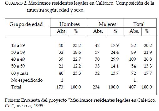 This article describes a community of Mexican immigrants legally residing in the city of Calexico, California. Firstly, a brief review on the history of migration from Mexico to the United States, chiefly to Imperial County, is presented. Afterwards, the traits of the immigrant group is described according to the data coming from a survey that was applied to 407 Mexican immigrants. To conclude, the results provided by the survey on the causes for such emigration, the motives for immigrating, as well as the bearing existing between the immigrant and his/her country of origin, through the return migration, are all presented.