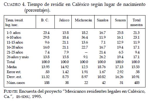 El estatus de residente legal y el tiempo de residencia de los inmigrantes en la ciudad de Caléxico, son variables que pueden mostrar el grado de asimilación que tiene el inmigrante en el país. El cuadro 4 presenta el tiempo de residencia de los inmigrantes por grupos de años de residencia y lugar de nacimiento, y en él se observa que la mayoría de los inmigrantes tiene seis o más años de residencia, lo que en conjunto representa cerca de 80% del total de la muestra.