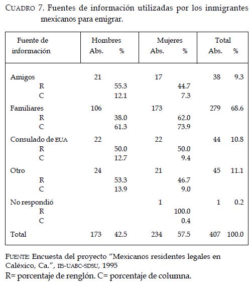 Otro factor que influye en los migrantes es la información que se establece a través de las redes sociales, los familiares o paisanos que se encuentran ya establecidos en el extranjero y envían información sobre el lugar, las oportunidades de trabajo que existen y sobre las maneras de inmigrar (ver cuadro 7). Así, tenemos que 68.6% de los entrevistados obtuvo información por parte de algún familiar; 10.8% a través del Consulado de Estados Unidos en México, y 9.3% de los amigos; estas redes sociales de información no sólo se utilizan para enviar información, sino que en gran medida brindan seguridad y facilitan a los nuevos migrantes su integración al lugar de destino (Massey, 1991:319).
