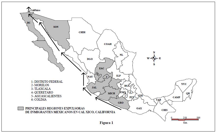 Otro aspecto a señalar es que las entidades federativas mexicanas que se ubican en la costa del Pacífico desde Michoacán hasta Baja California aportan alrededor de 80% de los inmigrantes legales en Caléxico (ver figura 1). Es importante señalar que estos estados mexicanos son los mismos que, en el municipio de Mexicali en particular y en Baja California en general, aportan los mayores porcentajes de su población no nativa.