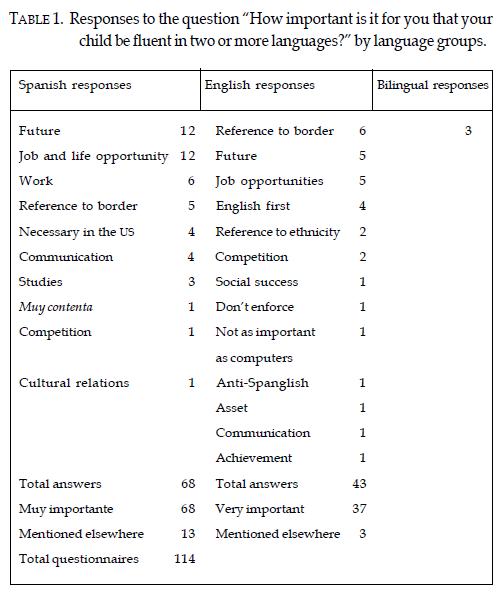 9 Further investigation will help clarify this issue. Nonetheless, I resist using the terms "Spanish-speaking" or "English-speaking" when referring to this population, since it is unclear how many parents are bilingual. Furthermore, I cannot assume that language choice alone indicates the ethnic identity of the parents.