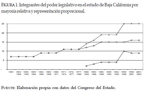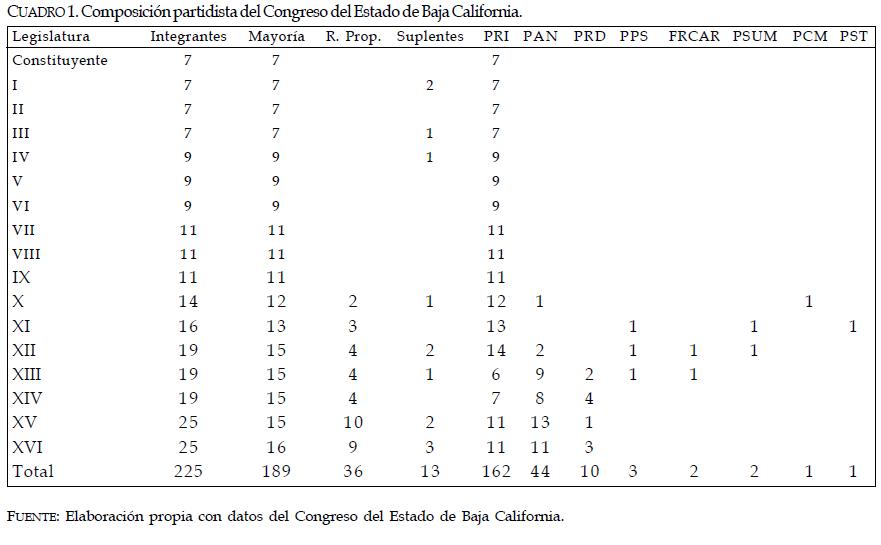 La hegemonía del Partido Revolucionario Institucional se mantuvo inalterada en el Congreso del Estado de Baja California durante 36 años, que comprendieron de la I a la XII legislatura. Por su parte, el número de curules fue aumentando a medida que crecía el número de distritos y por la introducción del mecanismo de la representación proporcional en 1980 (ver figura 1).