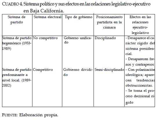 Esta analogía la hacemos para explicar el cuadro 4, en donde observamos cambios estructurales de orden político que inciden en las relaciones ejecutivo-legislativo en Baja California. Bajo el sistema de partido hegemónico (PRI), el comportamiento cameral era disciplinado, con lo que el proceso decisional era fluido gracias a la conformación de gobiernos unificados (de 1953 a 1989) en el marco de un sistema electoral no competitivo.