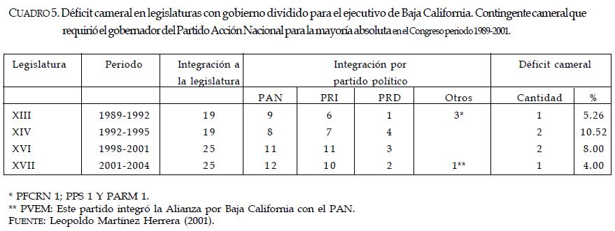 Al comparar la tipología de Alonso Lujambio nos percatamos de que el Congreso de Baja California ha presentado la situación prevista en el caso donde el Partido Acción Nacional ha logrado la mayoría relativa en tres legislaturas, a saber: XIII, XIV, XV y XVII (ver cuadro 5). En cambio, en la legislatura XV se presenta la situación de gobierno unificado, y en la XVI la fracción panista y priísta logran el mismo número de curules (11).
