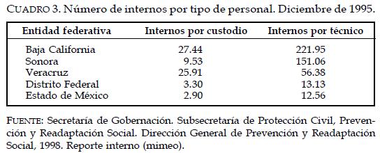 Otro de los graves problemas de la mayoría de los centros penitenciarios del país es la falta de personal especializado para brindar atención y tratamiento adecuado a los internos (v. gr. custodios, psicólogos, médicos, odontólogos, entre otros), ya que 22% de los cereso no tiene suficiente personal técnico, administrativo y de custodia. En este rubro Baja California ocupa el primer lugar (ver cuadro 3).