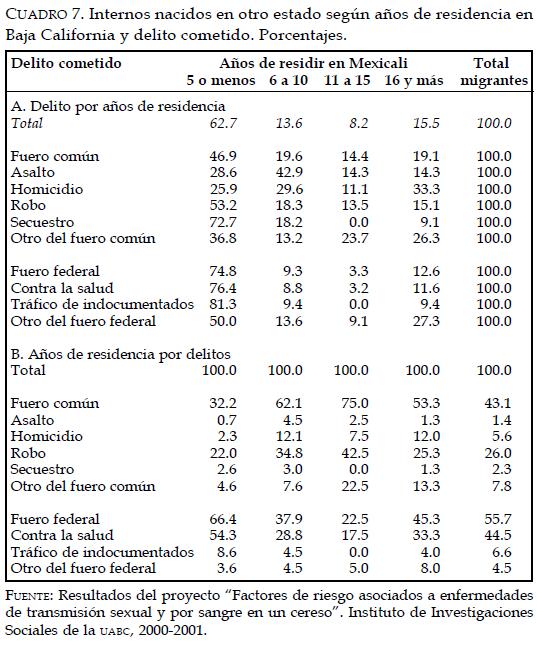 Una forma indirecta de aproximarnos al fenómeno de la delincuencia y sus posibles nexos con la migración es mediante el estudio de internos en los centros de readaptación social (cereso), puesto que son un reflejo del perfil delictivo de la sociedad a la que pertenecen aunque hay que reconocer que evidentemente no están recluidas en los cereso todas las personas que delinquen. En este sentido, el objetivo de este trabajo es presentar el perfil de los internos entrevistados en el Cereso de Mexicali en torno a dos temas: por un lado, los delitos que motivaron su reclusión, y por el otro, el consumo de drogas, diferenciando en el análisis a los reclusos según lugar de nacimiento.