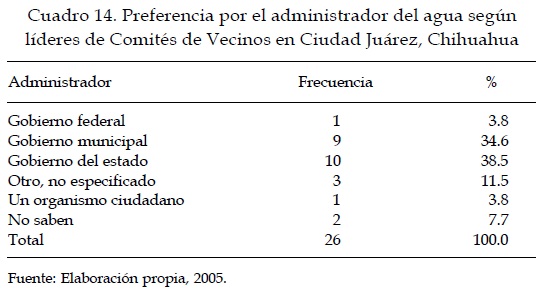 Los líderes dividen su opinión respecto a quién debería administrar el agua en la ciudad. De los 26, nueve se manifiestan por el gobierno municipal; 10 por el gobierno del estado; tres por otro no especificado; uno por el gobierno federal y dos no saben (cuadro 14). La preferencia es por los gobiernos locales con una ligera inclinación hacia el gobierno del estado como se encuentra ahora.