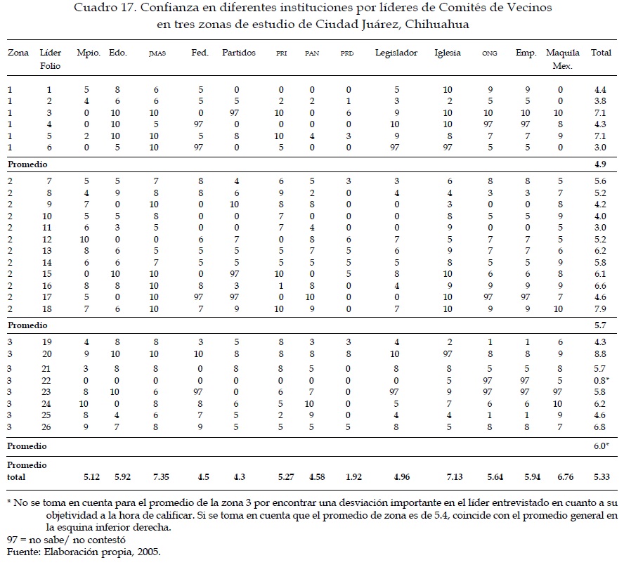 En el caso de la confianza que manifiesta cada líder es importante destacar que a mayor marginación existe menor confianza en las instituciones, y que los líderes ligados al sistema político partidista declaran tener una mayor confianza. En efecto, en la zona de Anapra cuatro de los seis líderes dan una calificación menor a cinco; en la zona de la sierra de Juárez, sólo tres de los 12 líderes dan el mismo puntaje, y en las zonas de Infonavit y Acequias, esto sucede en sólo dos de los ochos casos. Por otro lado, los líderes apegados al sistema le dan una calificación alta a las instituciones, esto se observa con mayor claridad en los líderes ligados al PRI en la zona de Anapra y los vinculado con el PAN en la colonia Felipe Ángeles.