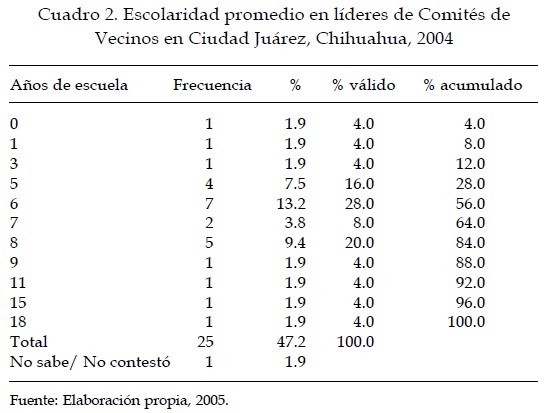 En cuanto a sus ocupaciones, 11 de estos líderes son amas de casa, cinco trabajan en el sector comercio y servicios, dos son empleados de maquiladora, uno es empleado de gobierno y el resto labora en otras actividades. Los líderes tienen una escolaridad promedio de 6.92 años, que significa el grado de primero de secundaria, aunque se observa un caso de cero escolaridad y otro con posgrado; asimismo, el 56% de los líderes ha llegado hasta sexto año de escolaridad (cuadro 2). También se observa que en la zona 3 de Acequias el promedio de escolaridad en los líderes aumenta a 9.1.