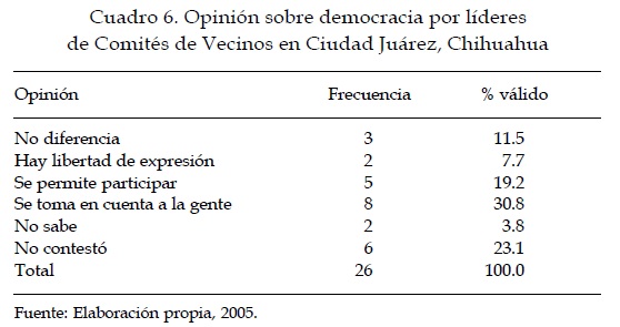 Al preguntarles la diferencia entre un gobierno democrático y uno no democrático encontramos que al menos 15 de los 26 líderes sí distinguen una diferencia al reconocer conceptos que impone la democracia como la libertad de expresión, la participación y el reconocimiento de la gente como actores. se observa también que seis líderes no contestaron la pregunta, dos no saben y tres no conocen la diferencia (cuadro 6).