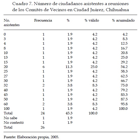 Los CV representan en promedio a 1 822 personas que se encuentran habitando 404 hogares, considerando que cada hogar se compone aproximadamente de 4.5 habitantes.5 De estos representados, asisten a las reuniones un promedio de 27 ciudadanos que a su vez son representantes de 27 hogares, por lo tanto sólo asiste 6.7% de los ciudadanos del comité (cuadro 7).