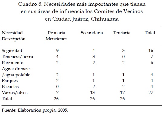 De acuerdo con los líderes entrevistados, las necesidades más importantes para su colonia o territorio son, en orden de importancia: seguridad pública, tenencia de la tierra y pavimento. otras necesidades se relacionan con agua (agua potable y saneamiento), parques públicos y equipamiento educativo (cuadro 8).