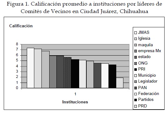 Por el lado de las instituciones, la Junta Municipal de Agua y Saneamiento alcanza el mayor promedio con 7.35, seguida por la iglesia en general con 7.13, la maquiladora con 6.76, la empresa privada mexicana con 5.94, el gobierno del estado con 5.92, las organizaciones no gubernamentales con 5.64, el PRI con 5.27, el gobierno municipal con 5.12, los legisladores en general con 4.96, el PAN con 4.58, el gobierno federal con 4.5, los partidos políticos en general con 4.3 y el PRD con 1.92 (figura 1).
