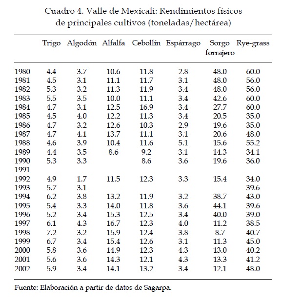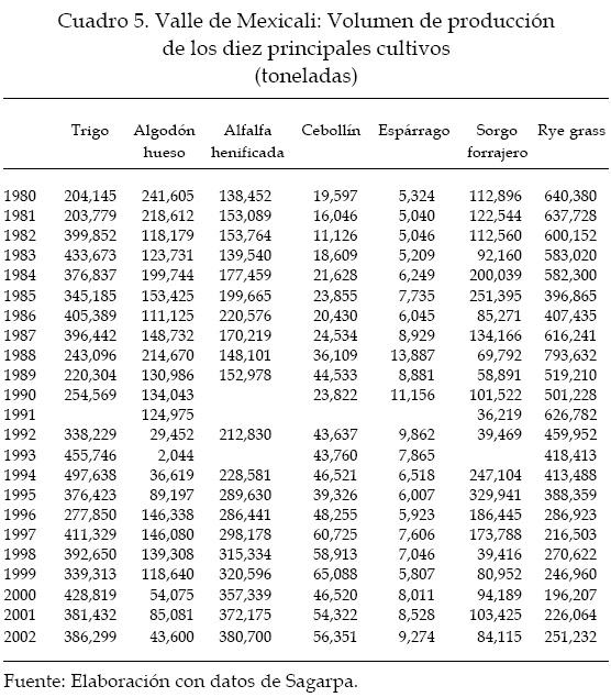 3 La obra citada del doctor José Luis Calva es una referencia que ilustra con tino el crucial entorno económico del desarrollo agrícola. Abundar sobre este tema, sin embargo, sobrepasa el propósito de este artículo, el cual está limitado al examen de la evolución productiva de la región agrícola del Valle de Mexicali.