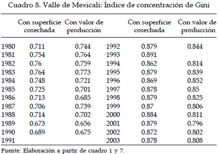 El índice de Gini no supera el nivel de 0.8 durante los ochenta, pero a partir de 1992 y hasta la fecha tiene un comportamiento superior. La predominancia de cultivos como el trigo y el algodón, seguidos de la alfalfa, el sorgo forrajero y hortalizas como el cebollín, hacen que el patrón de cultivos de la región éste altamente concentrado, es decir, la diversificación productiva del Valle de Mexicali, en términos objetivos, es cada vez más reducida.
