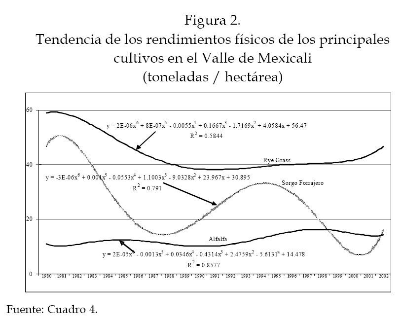 Utilizando las series de tiempo de la productividad física por hectárea de los siete principales cultivos de la región, se pueden concluir los comportamientos negativos del rye-grass y el sorgo forrajero, el estancamiento del algodón y el espárrago, y un modesto incremento del cebollín, el trigo y la alfalfa (figuras 2 y 3).