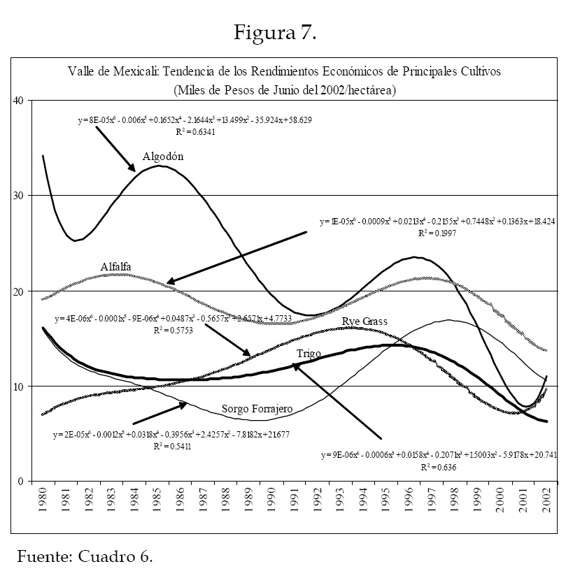 También es necesario hacer notar que la línea tendencial de este indicador en los diferentes cultivos no refleja la aplicación de recursos públicos como Procampo y Alianza para el Campo; sí refleja, en cambio, afectaciones por plagas, como la mosquita blanca que deterioró severamente la producción de algodón en 1992. La productividad física no se altera por Procampo y otros programas de Alianza debido a que en su diseño político la asignación de los recursos tiene la característica de no destinarse a las vertientes que afectan directamente el modo de producción, como son los cambios en la aplicación de tecnología, o indirectamente como la asignación de apoyos por unidad producida, lo cual sería un aliento significativo a producir más cambiando el modo de producción.